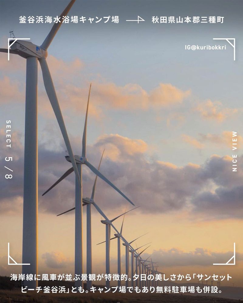 海岸線に風車が並ぶ景観が特徴的。夕日の美しさから「サンセットビーチ釡谷浜」とも。キャンプ場でもあり無料駐車場も併設。