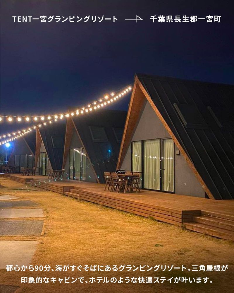 都心から90分、海がすぐそばにあるグランピングリゾート。三角屋根が印象的なキャビンで、ホテルのような快適ステイが叶います。