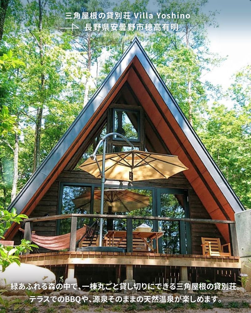 緑あふれる森の中で、一棟丸ごと貸し切りにできる三角屋根の貸別荘。テラスでのBBQや、源泉そのままの天然温泉が楽しめます。