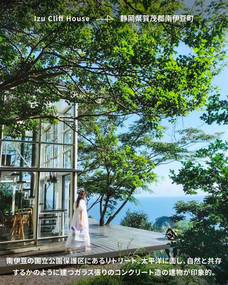 南伊豆の国立公園保護区にあるリトリート。太平洋に面し、自然と共存するかのように建つガラス張りのコンクリート造の建物が印象的。