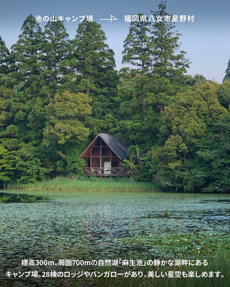 標高300m、周囲700mの自然湖「麻生池」の静かな湖畔にあるキャンプ場。28棟のロッジやバンガローがあり、美しい星空も楽しめます。