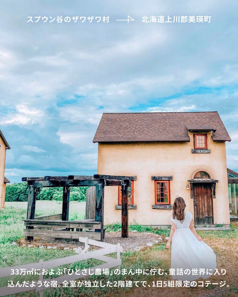 33万㎡におよぶ「ひとさじ農場」のまん中に佇む、童話の世界に入り込んだような宿。全室が独立した2階建てで、1日5組限定のコテージ。