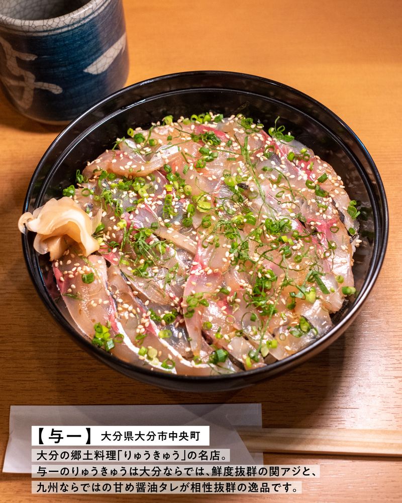 大分の郷土料理「りゅうきゅう 」の名店。与一のりゅうきゅうは大分ならでは、鮮度抜群の関アジと、九州ならではの甘め醤油タレが相性抜群の逸品です。