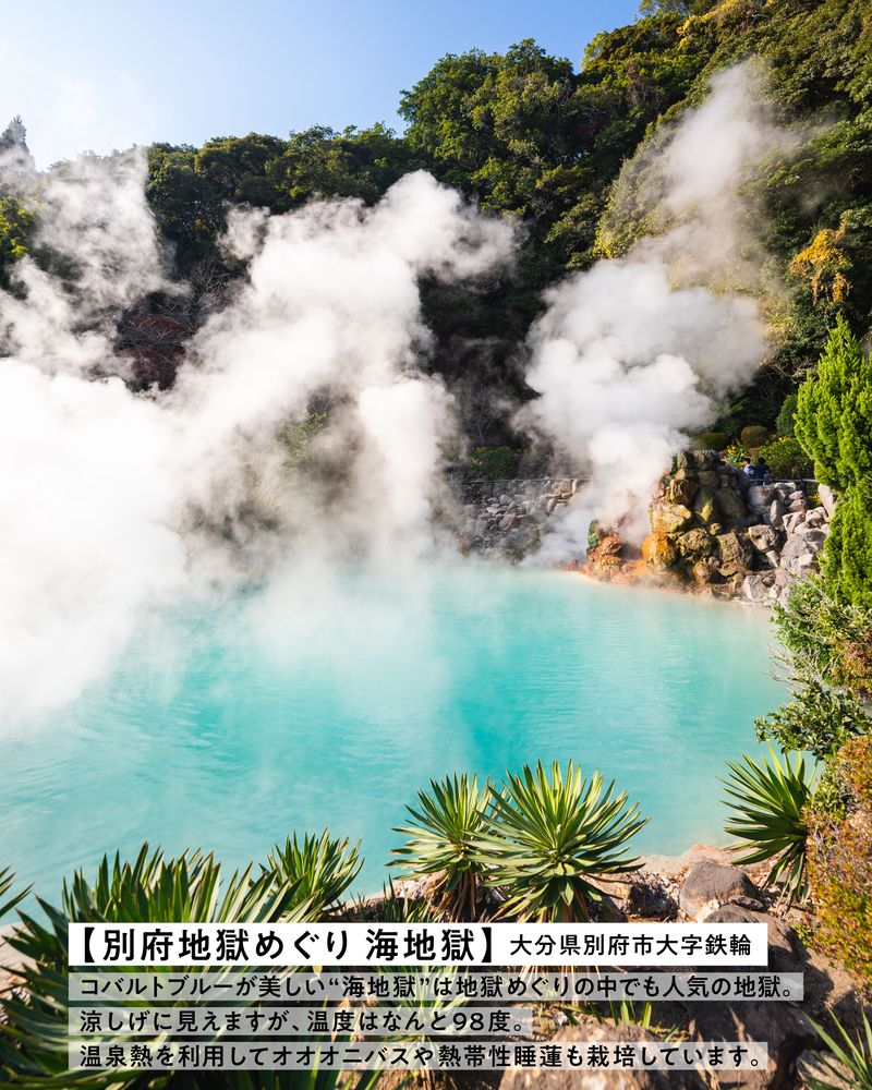 別府観光の定番「べっぷ地獄めぐり」。コバルトブルーが美しい海地獄は中でも人気の地獄です。涼しげに見える温泉ですが、温度はなんと98度!温泉熱を利用してオオオニバスや熱帯性睡蓮も栽培しています。※開花期は5月上旬~11月下旬。朝方が見ごろです。
