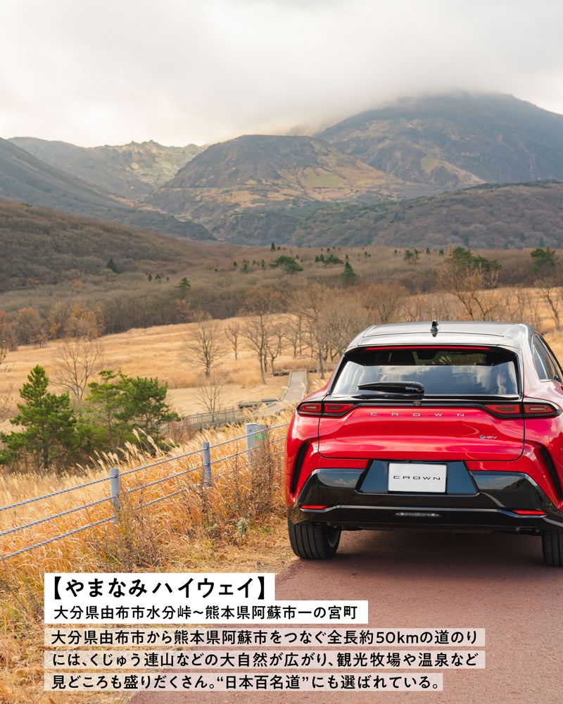 "日本百名道"にも選ばれているやまなみハイウェイ。大分県由布市から熊本県阿蘇市をつなぐ全長約50kmの道のりには、くじゅう連山などの大自然が広がり、観光牧場や温泉など見どころが盛りだくさん。