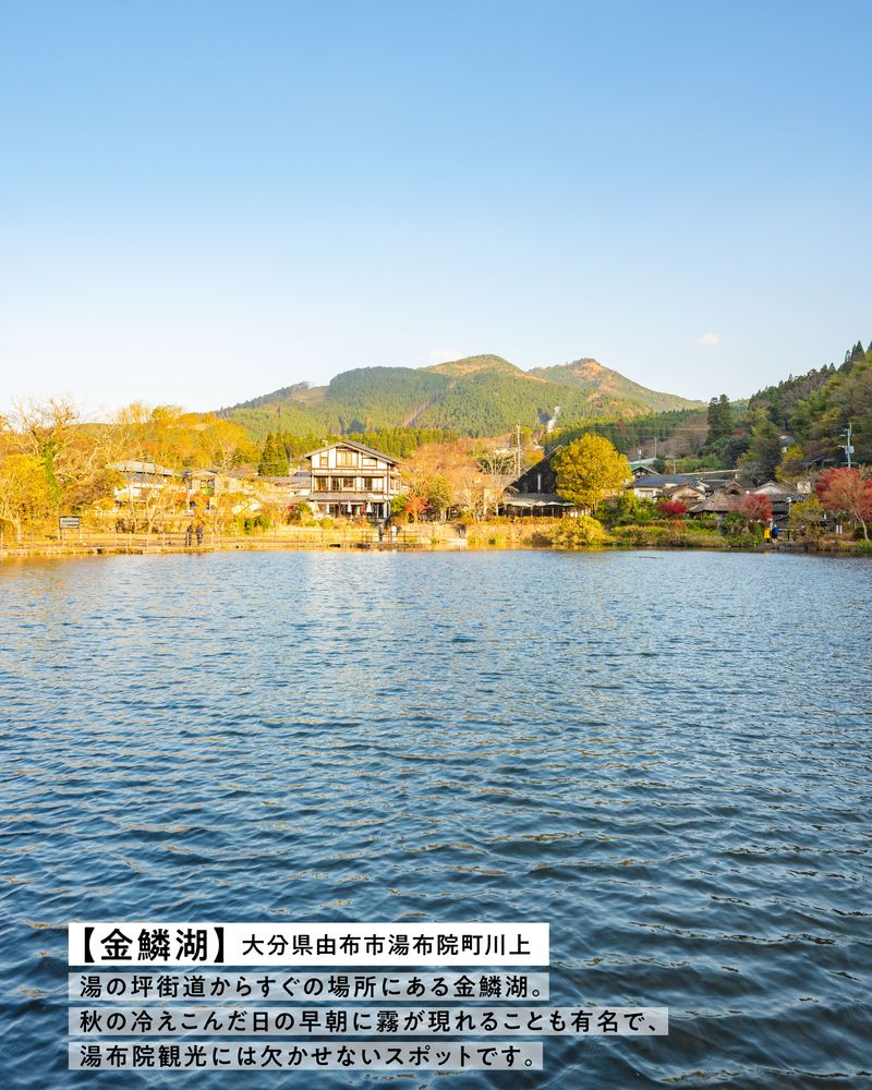湯の坪街道からすぐの場所にある金鱗湖。秋の冷えこんだ日の早朝に霧が現れることも有名で、湯布院観光には欠かせないスポットです。