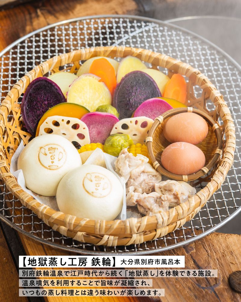別府鉄輪温泉で江戸時代から続く「地獄蒸し」を体験できる施設。温泉噴気を利用することで旨味が凝縮され、いつもの蒸し料理とは違う味わいが楽しめます。