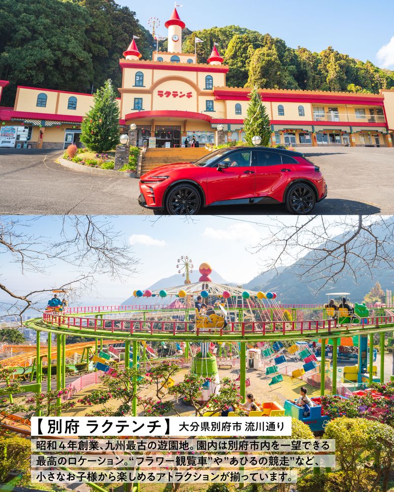 昭和4年創業、九州最古の遊園地、別府ラクテンチ。ケーブルカーに乗って入園する園内は別府市内を一望できる最高のロケーション。"フラワー観覧車"や"あひるの競走"など、小さなお子様から楽しめるアトラクションが揃っています。