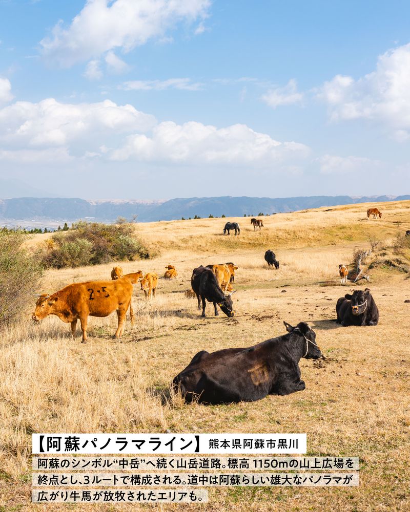 道中は阿蘇らしい雄大なパノラマが広がり牛馬が放牧されたエリアも。