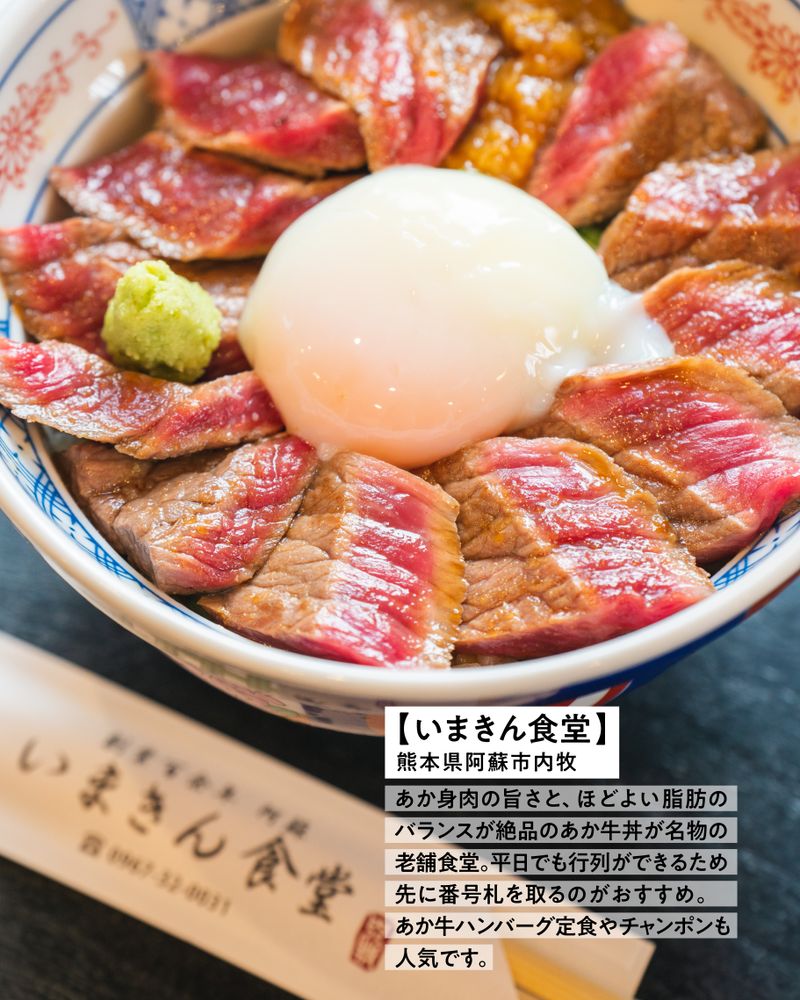 あか身肉の旨さと、ほどよい脂肪のバランスが絶品のあか牛丼が名物の老舗。いまきん食堂。