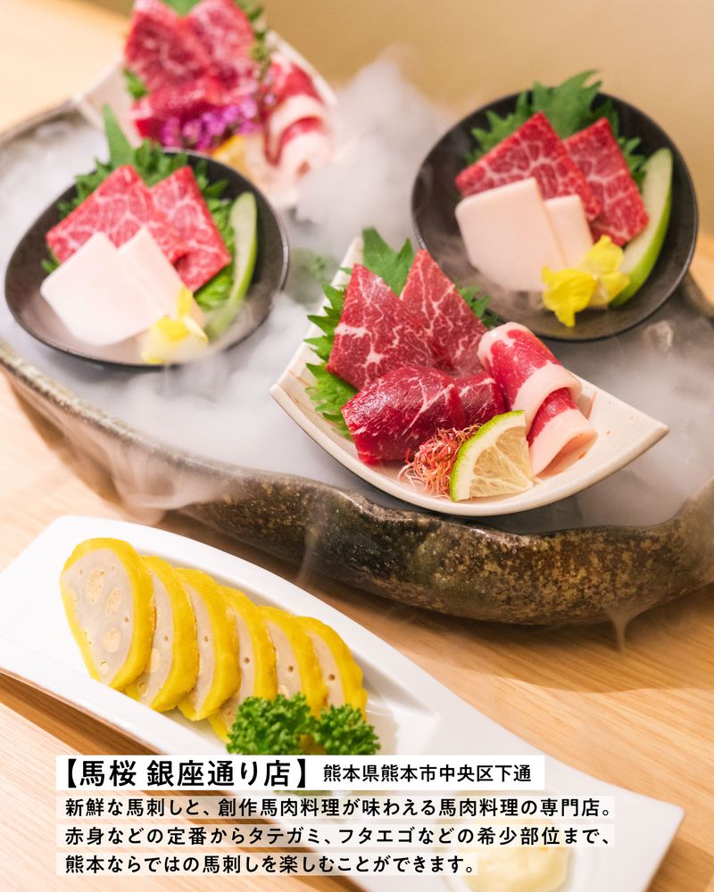 赤身などの定番からタテガミ、フタエゴなどの希少部位まで、熊本ならではの馬刺しを楽しむことができます。