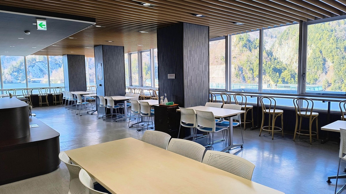 窓の外に広がる壮大なダムの景色を眺めながら、名物の緑色の「黒部ダムカレー」を味わえます。景色も味も楽しめる最高のランチ体験です。