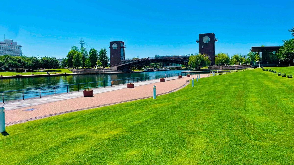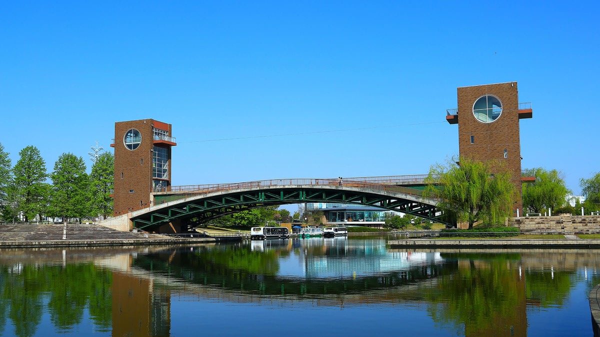 富岩運河の水辺が美しい都市公園。運河を囲む広大な敷地には、天門橋の展望塔や水辺の景観を楽しめるカフェがあり、休憩に利用できます。特に桜の季節や夜間のライトアップ時は幻想的で、散策や憩いの場として人気が高く、日本の歴史公園100選にも選ばれています!