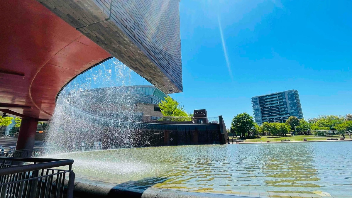 水のカーテンと湧泉で構成する「泉と滝の広場」には、川の最上流部をイメージする滝と、湧水をイメージする水盤があります。