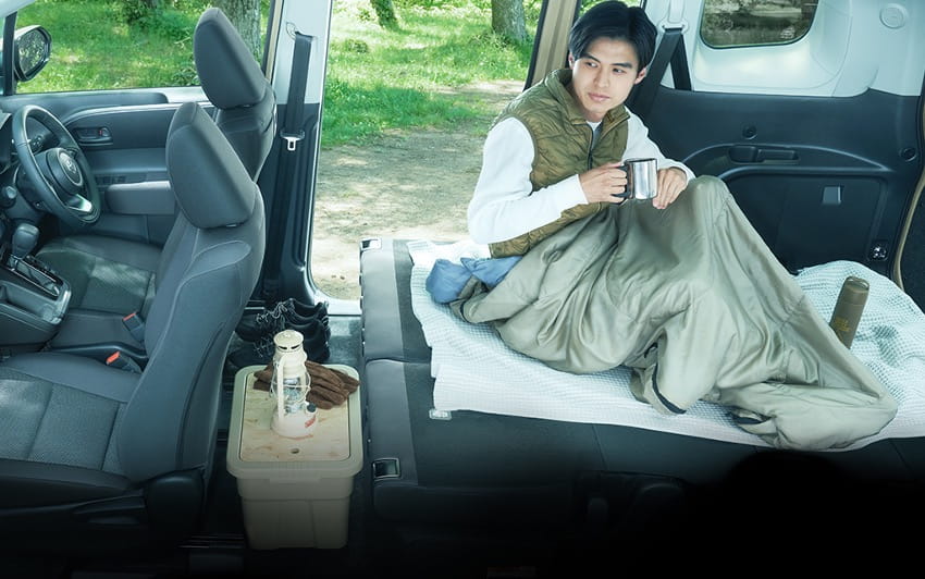シートをアレンジすれば車内で寝られる空間も確保できます。防水シート装備など汚れに強い内装の車種なら、泥や水で汚れた道具も気兼ねなく載せられます。