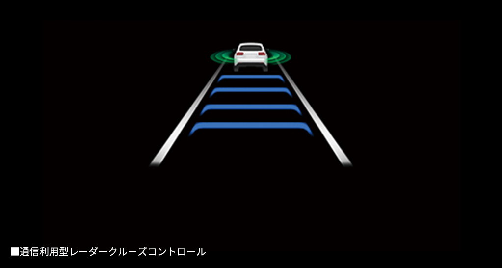 レーダークルーズコントロールで先行車に追従している時、先行車が通信利用型レーダークルーズコントロール対応車両であれば、車車間通信により取得した先行車の加減速情報にすばやく反応して車間距離や速度の変動を抑制し、スムーズな追従走行が可能となります。