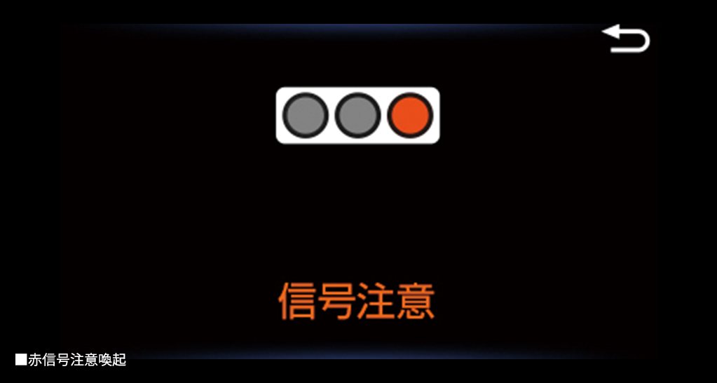 赤信号を認識している場合に、信号を見落として交差点に進入する可能性があるとシステムが判定したときには、ディスプレイの点滅表示やブザーにより注意を促します。
