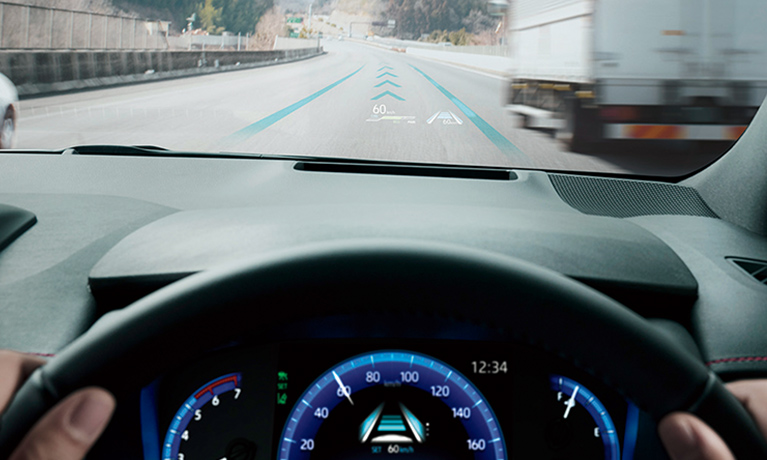 レーダークルーズコントロールで走行中、システムが必要と判断した場合、ステアリングの切り始めで速度抑制を開始し、同時にマルチインフォメーションディスプレイでシステム作動中であることをお知らせします。