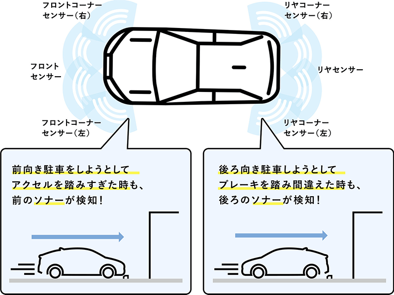 前後4つずつ、計8つのセンサーで障害物を検知し、アクセルとブレーキの踏み間違いの際に、衝突被害軽減ブレーキをかけます。