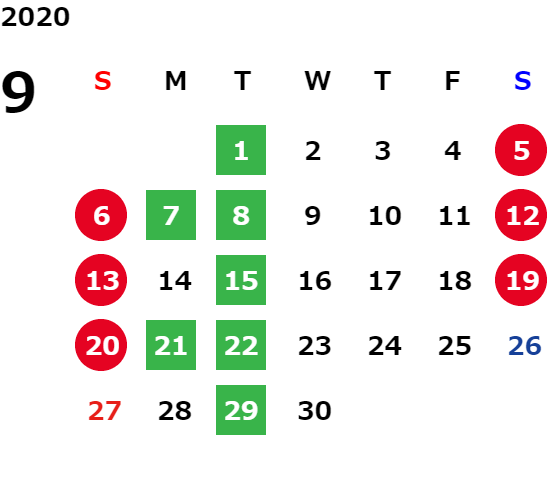 毎週火曜日、及び月毎に定める特定の日を定休日とさせて頂きます。