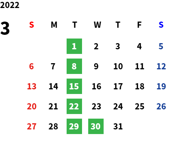 毎週月曜日と第1・第3火曜日になります 定休日については営業日カレンダーをご参照下さい。