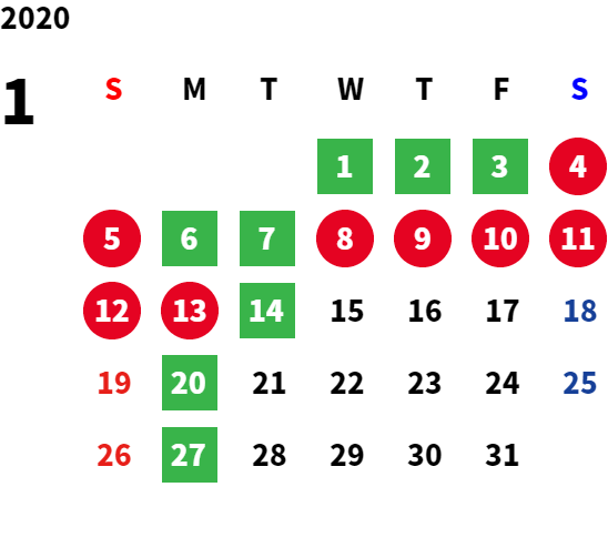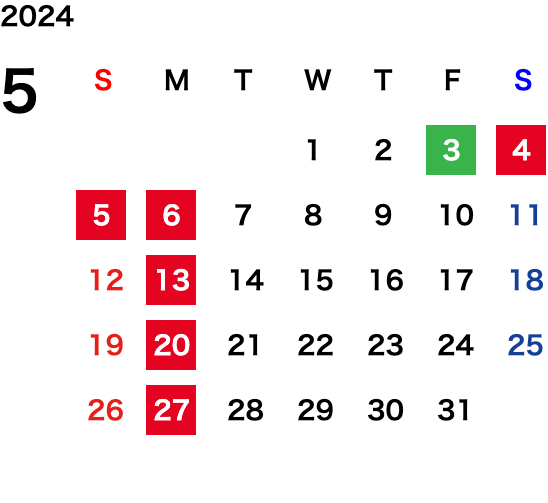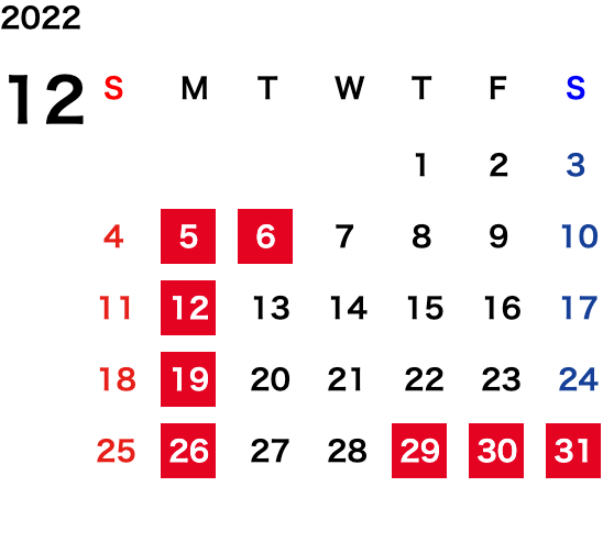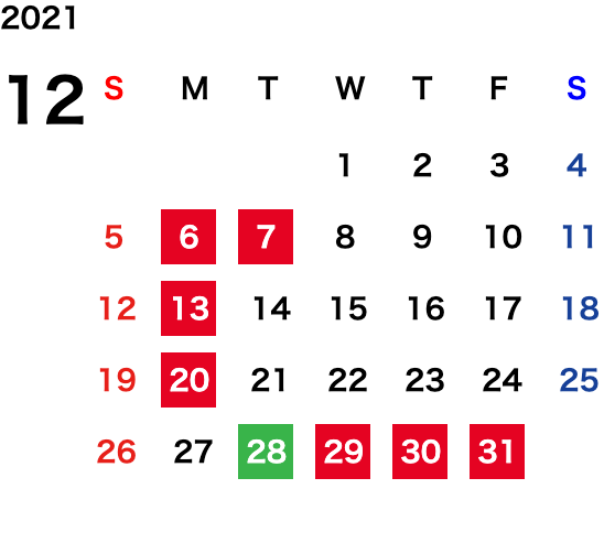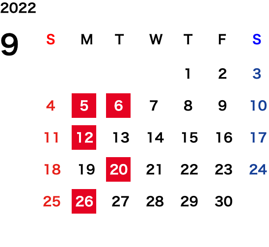 毎週月曜日・第一火曜日(変則的な場合がございます。詳細はカレンダーをご確認ください)