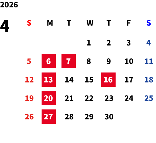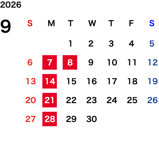 毎週月曜日・第一火曜日(変則的な場合がございます。詳細はカレンダーをご確認ください)