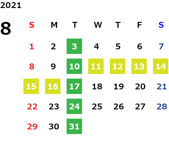 毎週火曜日・第二、第三水曜日(詳しくは営業日カレンダーをご確認ください。)