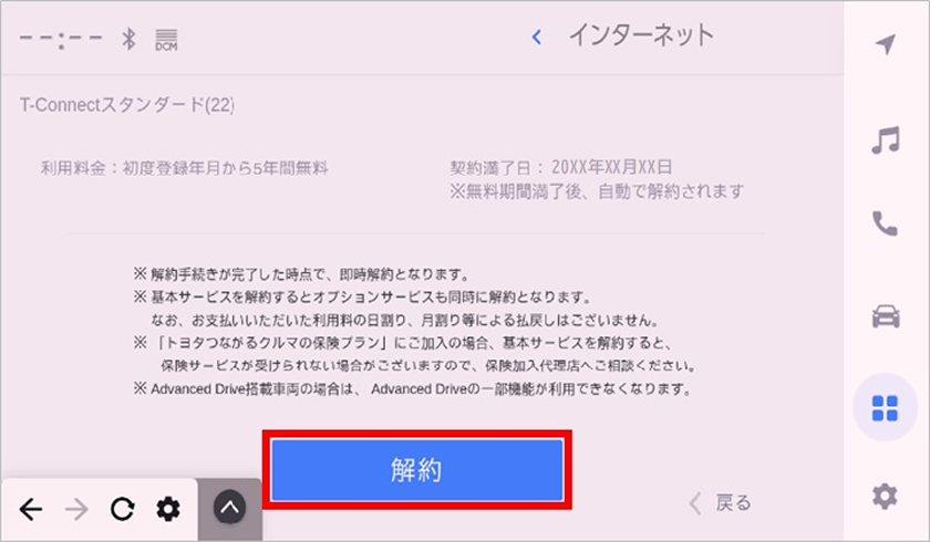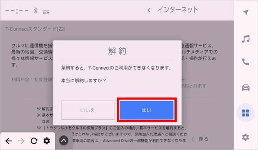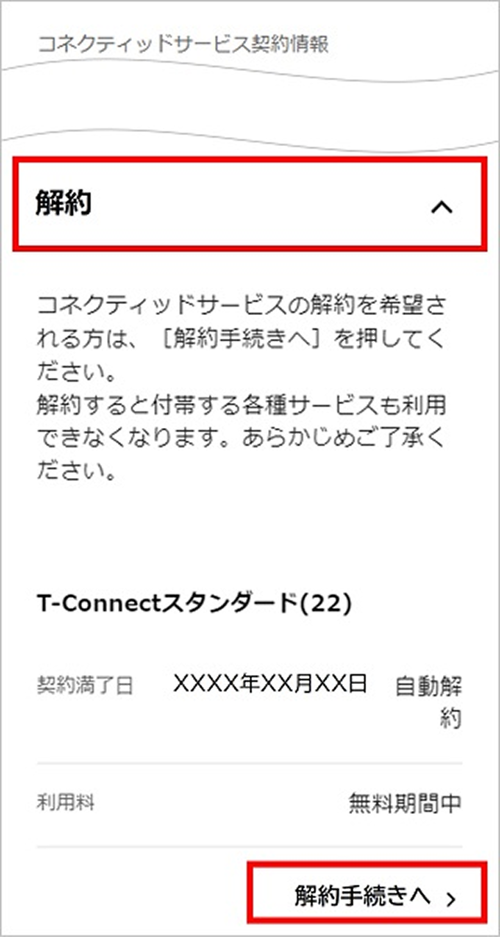 • T-Connect契約を解約されますと、T-Connectのサービスがご利用いただけなくなりますのでご注意ください。
