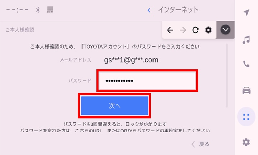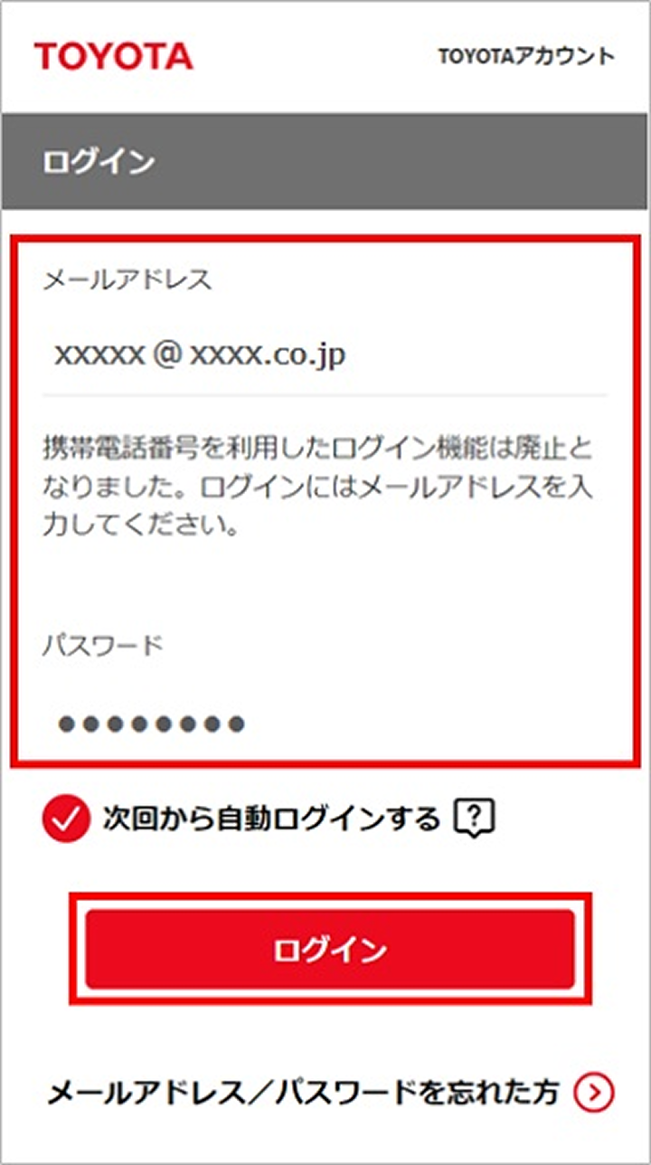 「TOYOTAアカウント」のメールアドレスとパスワードを入力して「ログイン」をクリック