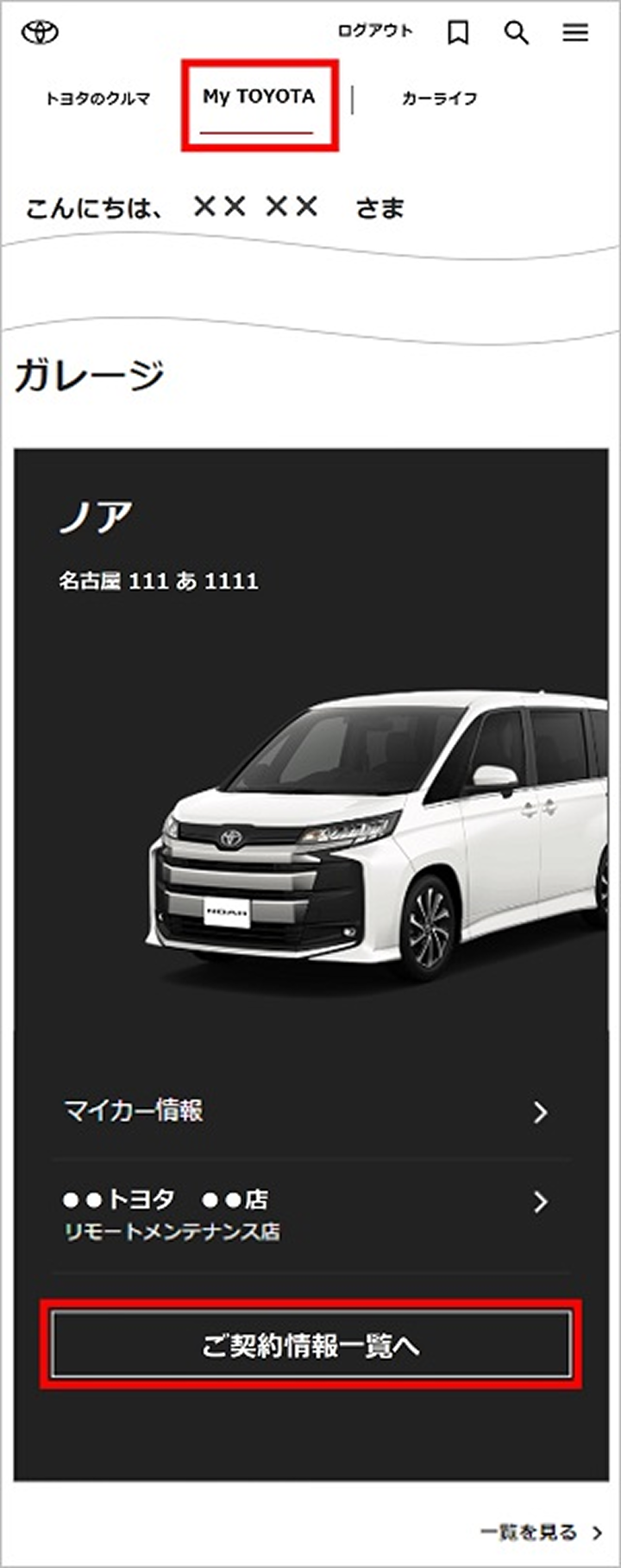 2. 「My TOYOTA」タブをクリックし、ガレージの「ご契約情報一覧へ」をクリック