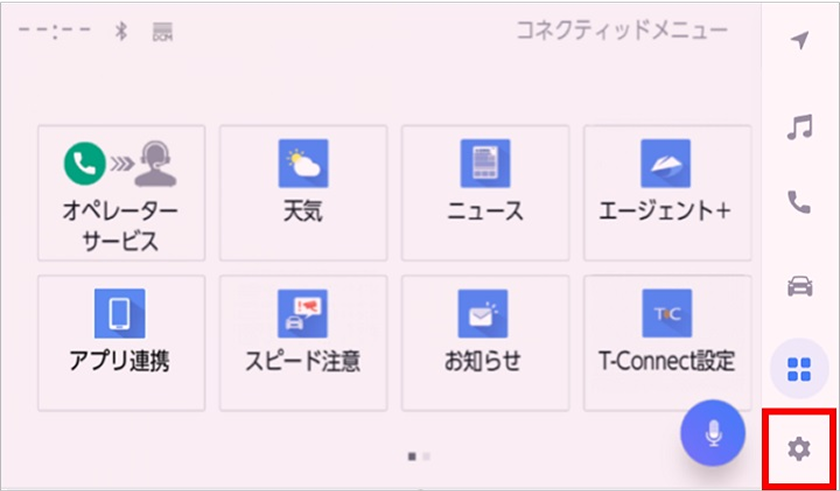 1. ナビ画面右下の「コネクティッドメニュー」(四角が4つ並んだマーク)の「T-Connect設定」をタッチ