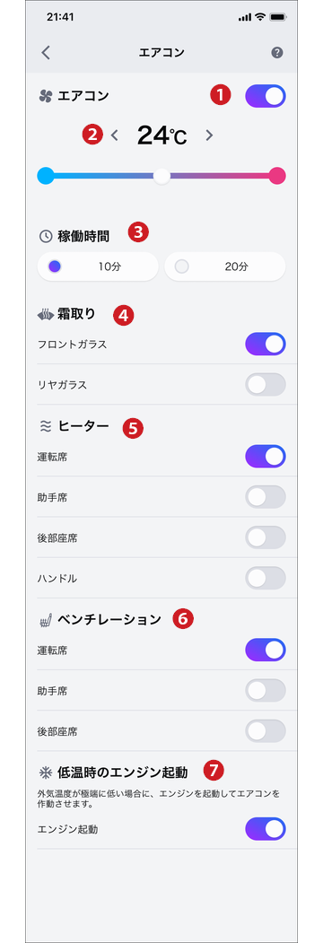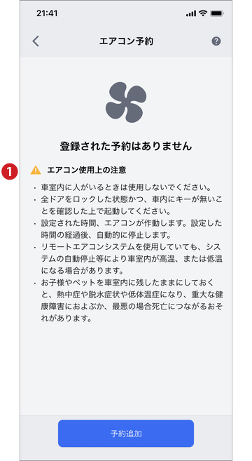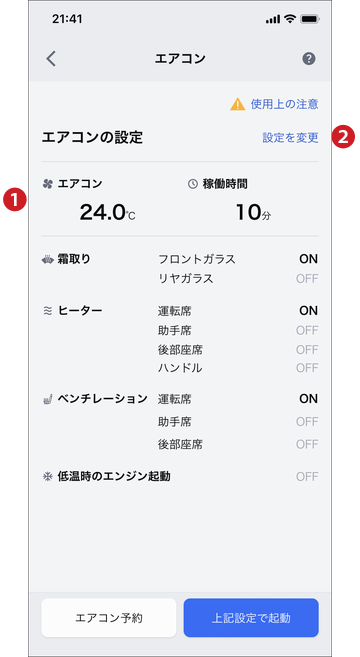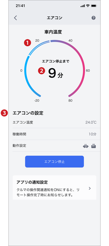 通知設定から通知のON/OFFを設定することができます。 クルマの状態によっては起動ができない場合もあります。通知内容をご確認ください。 指定した時間経過後、エアコンは自動で停止します。 駆動用電池残量が少なくなるとエアコンが停止する場合があります。 充電中にエアコンを使用すると、外部電源からの電力を使用して作動します。