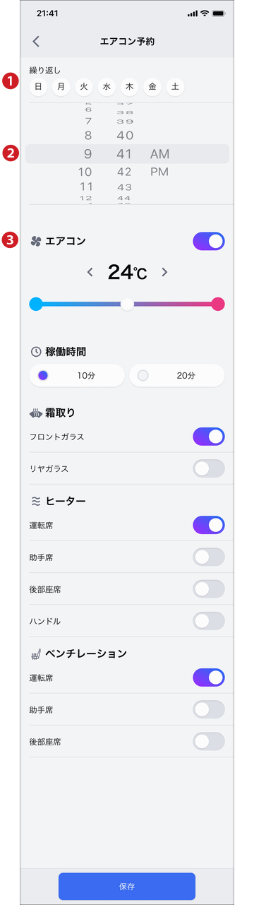 予約時間、エアコン設定を選択し、「保存」をタップ