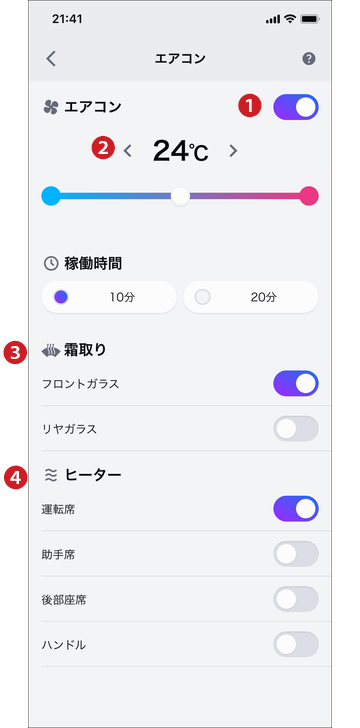 通知設定から通知のON/OFFを設定することができます。 クルマの状態によっては起動ができない場合もあります。通知内容をご確認ください。 20分経過後*、エアコンは自動で停止します。
