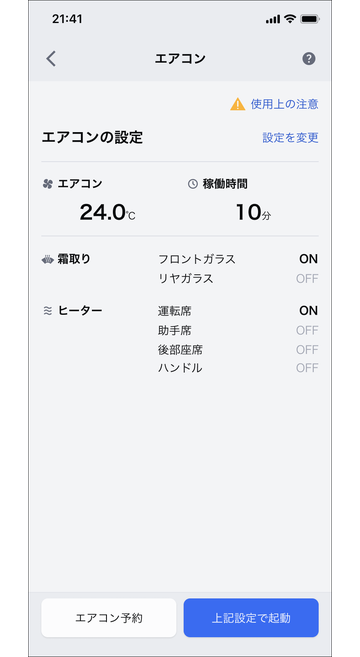 エアコン設定を確認し、「上記設定で起動」をタップ
