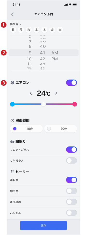 予約時間、エアコン設定を選択し、「保存」をタップ