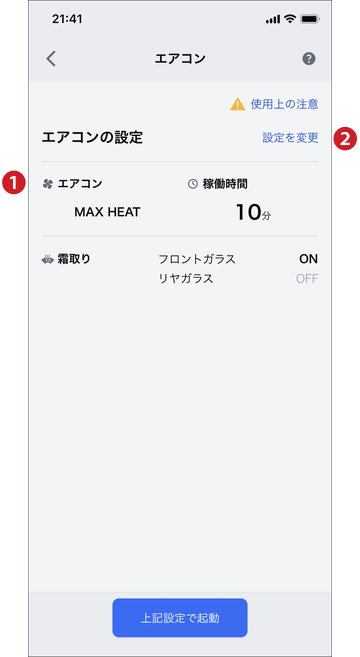 エアコン設定を確認し、「上記設定で起動」をタップ