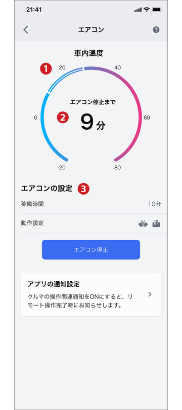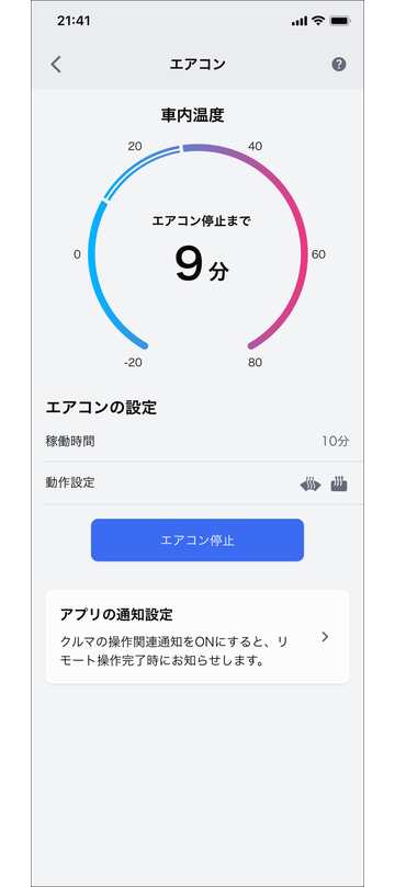 通知設定から通知のON/OFFを設定することができます。 クルマの状態によっては起動ができない場合もあります。通知内容をご確認ください。 10分経過後、エアコンは自動で停止します。 駆動用電池残量が少なくなるとエアコンが停止する場合があります。 充電中にエアコンを使用すると、外部電源からの電力を使用して作動します。