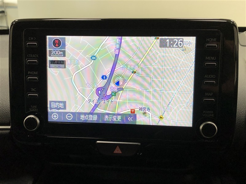 【8インチディスプレイオーディオ】各種オーディオ機能とスマホ連携機能を搭載。ナビキットを装着しているので、車載ナビとしても使用可能です。機能の詳細につきましては、展示店舗までお尋ねください。