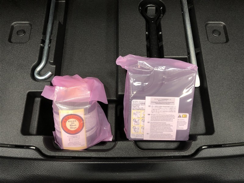 パンク修理キットです。補修材が入ったボトルとコンプレッサーがセットになっています。