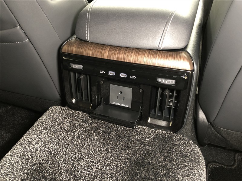 センターコンソールボックス後部には、アクセサリーコンセント(AC100V・1500W)と充電用USB端子(Type-C)2個が設置されています。後席に座る方も気軽に充電ができて便利です。