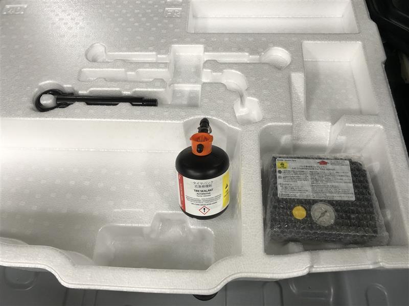 パンク修理キットです。補修材が入ったボトルとコンプレッサーがセットになっています。※ジャッキ&レンチ等の工具は、販売店装着オプションです。必要な方は別途ご購入いただくようになります。詳細は展示店舗まで