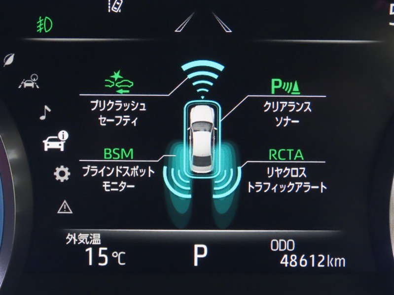 車線変更時などに、ドアミラーでは確認しにくい後側方エリア(ブラインドスポット)に存在する車両をレーダーで検知。警告サインをドアミラー等に表示することで、運転者に注意喚起する機能。