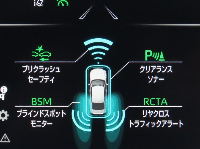 車線変更時などに、ドアミラーでは確認しにくい後側方エリア(ブラインドスポット)に存在する車両をレーダーで検知。警告サインをドアミラー等に表示することで、運転者に注意喚起する機能。