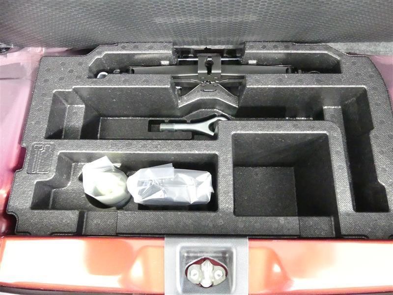 パンク修理剤とエアーポンプのセットです、応急用のキットとなります。 スペアタイヤは装備していませんが空いたスペースを小物入れとして使用できます