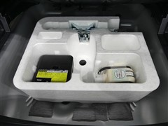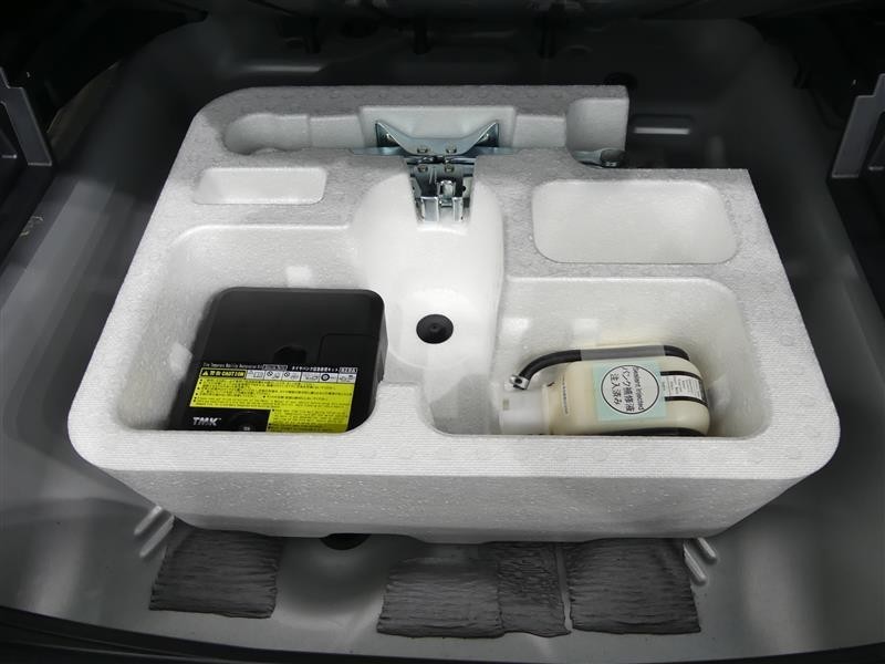 パンク修理剤とエアーポンプのセットです。スペアタイヤは装備していませんが空いたスペースを小物入れとして使用できます