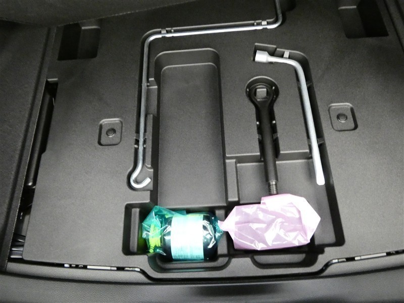 最近はパンク修理キットが標準ですね。タイヤの無い分軽量化と収納スペース確保できますね。