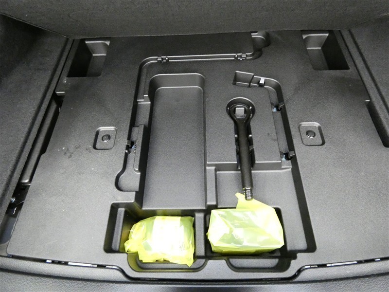 最近はパンク修理キットが標準ですね。タイヤの無い分軽量化と収納スペース確保できますね。