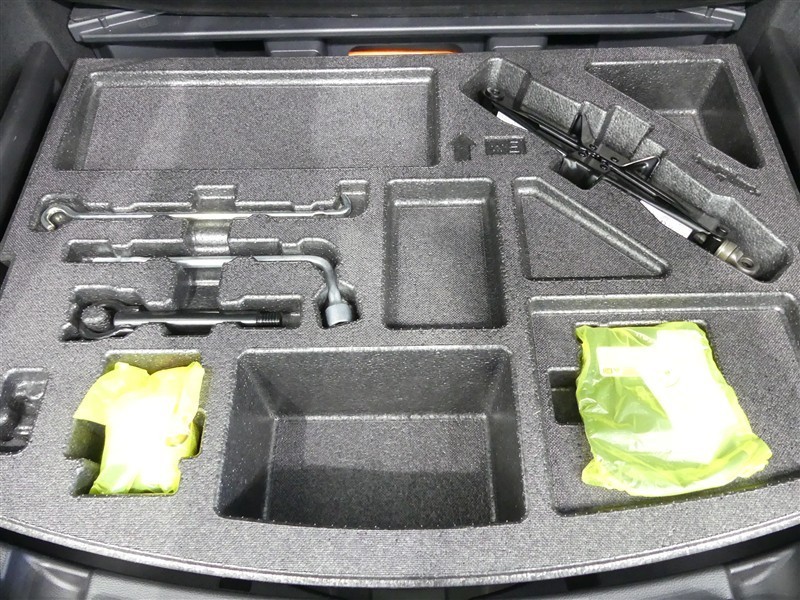 最近はパンク修理キットが標準ですね。タイヤの無い分軽量化と収納スペース確保できますね。